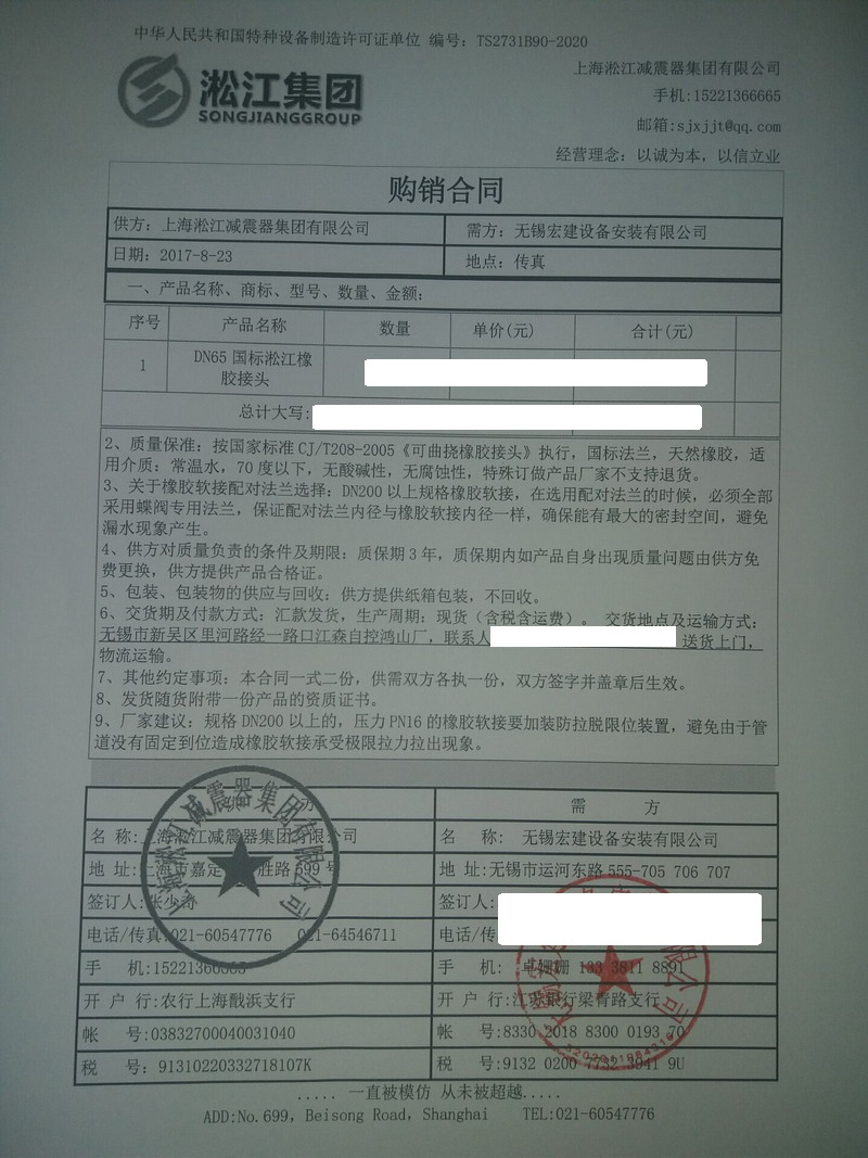 【無錫江森自控鴻山廠項目】DN65橡膠接頭合同